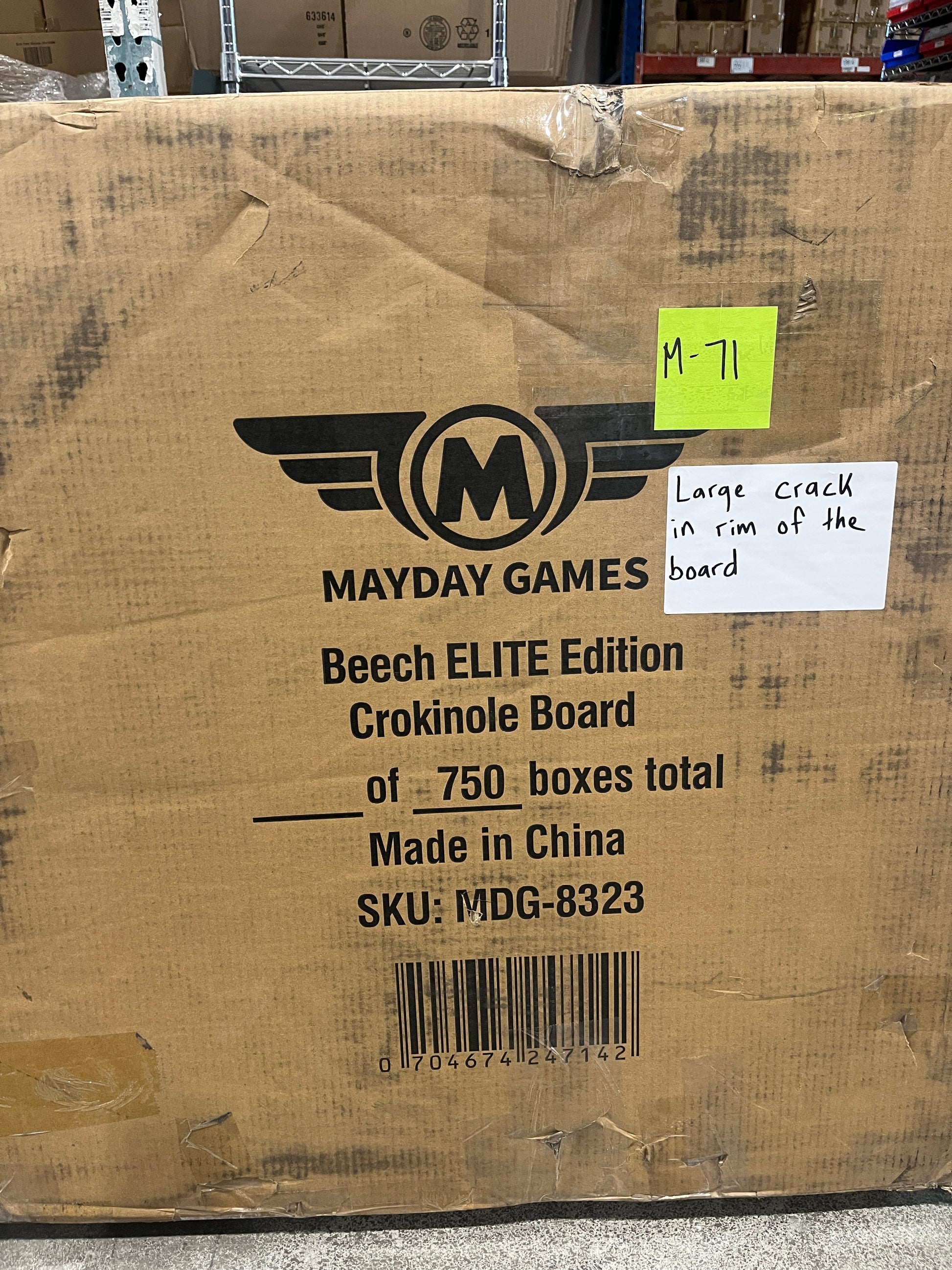 The boards consist of a 26" diameter playing surface + 2 inch ditch + 1/4 inch rim = 30.50 inches in total diameter and 3 inches thick. The game will come double boxed in a box with dimensions of 34.5 X 34.5 X 4.5 Inches and weights in at a massive 17.4 pounds (7.9 KG). Yes these are HUGE! Our boards meet the The World Crokinole Championship™ specifications which are: